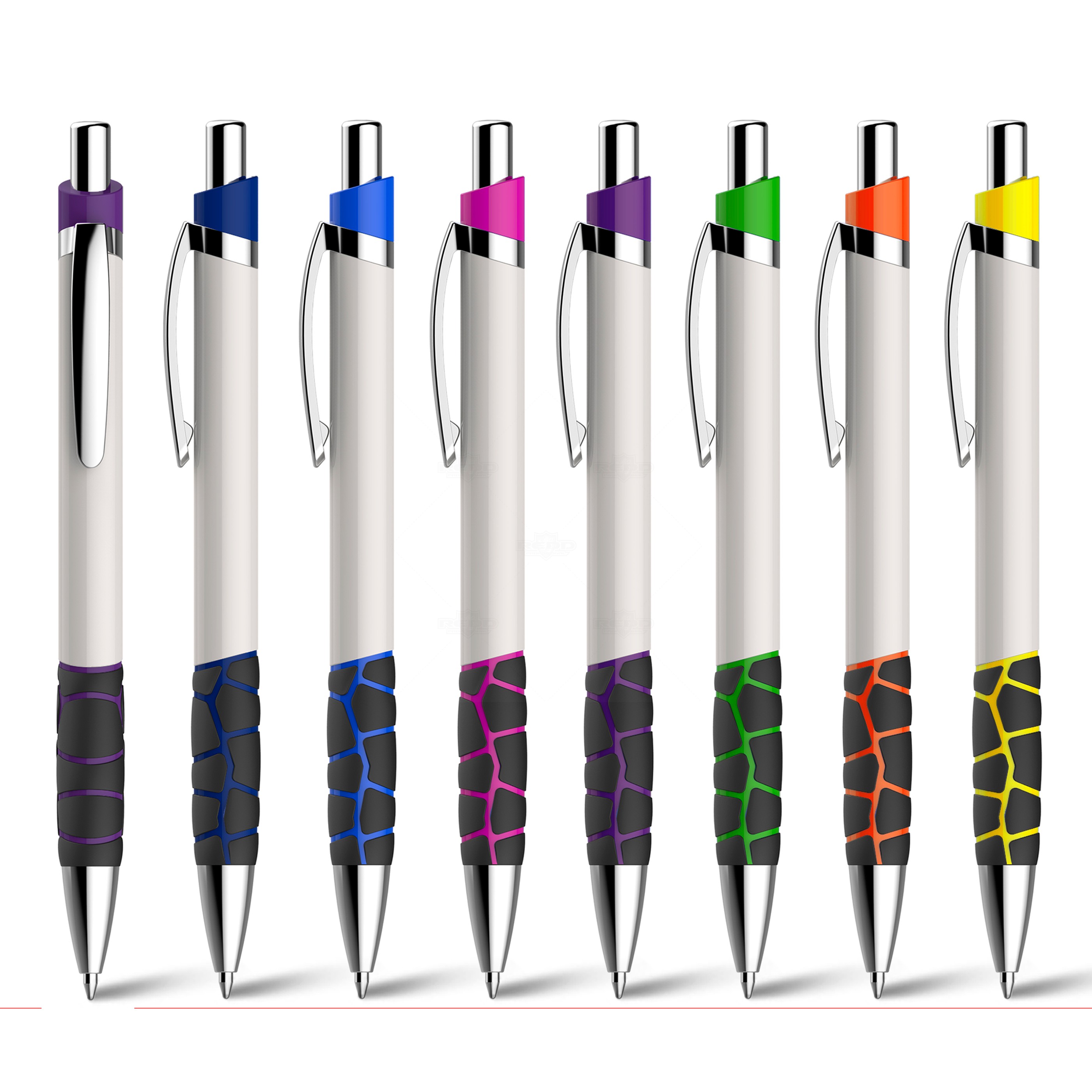 Descrição: Caneta plástica personalizada com design diferenciado no corpo da caneta que proporciona uma escrita mais firme e confortável. Possui esferográfica azul com clip de metal. Ideal para eventos corporativos e brindes promocionais. - Fortaleza